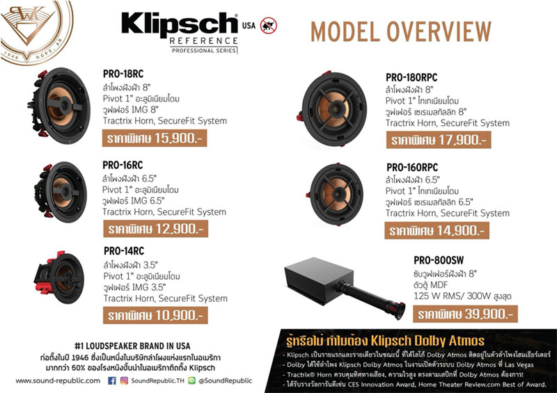 7.Klipsch ยังมีลำโพงในส่วนของระบบ Dolby Atmos ให้เลือกตามความต้องการที่แตกต่างกันไปตามการใช้งาน หรือการจัดวางที่สะดวกต่อการเคลื่อนย้ายของแต่ละคน ซึ่ง Klipsch ได้ตอบโจทย์เป็นอย่างมาก ในการที่มีลำโพงหลากหลายตัวสินค้าให้เลือกใช้งาน อาทิเช่น add-on R-41SA และ RP-500SA ที่เป็นลำโพงตั้งบนเซอร์ราวด์ ซึ่งจะทำหน้าที่ในการยิงเสียงสะท้อนขึ้นไปยังบนเพดานและยิงลงมายังผู้ฟังได้อย่างแม่นยำ หรือใครที่ไม่ต้องการจะตั้งลำโพงให้เกะกะ ท่านก็สามารถที่จะเลือกลำโพงแบบฝังฝ้า ไม่ว่าจะเป็นรุ่น PRO-18RC , PRO-16RC, PRO-14RC, PRO-180RPC, PRO-160RPC หากใครต้องการความกลมกลืน ลำโพงฝังฝ้าจาก Klipsch สามารถตอบโจทย์ได้เป็นอย่างดี สุดท้ายจะเป็น ลำโพงตั้งพื้นอย่าง RP-8060FA , R-625FA ที่ถูกพัฒนามาจากรุ่นเดิม ซึ่งจะพิเศษมากยิ่งขึ้น เพราะว่ามีช่องลำโพงที่ยิงเสียงขึ้นสะท้อนไปบนเพดาน เพื่อมอบประสบการณ์ที่สุดพิเศษสำหรับ Dolby Atmos