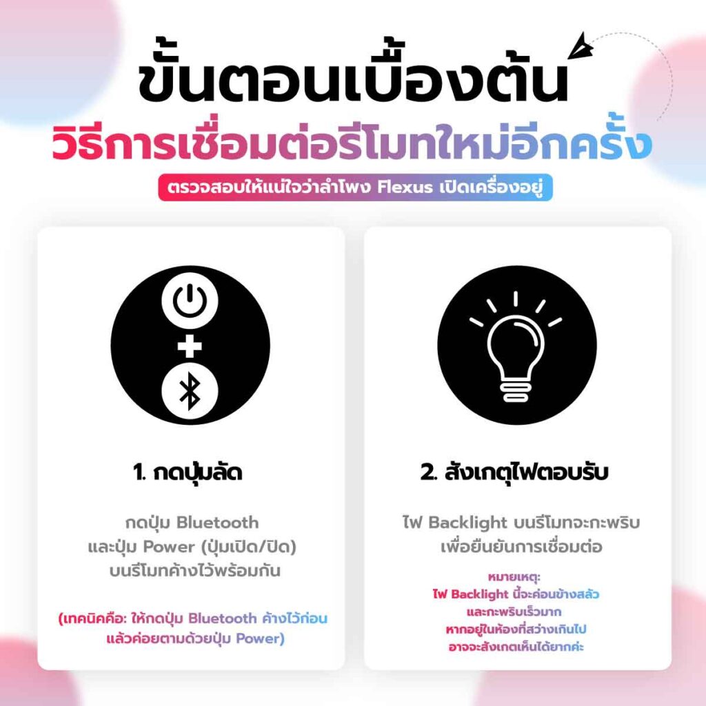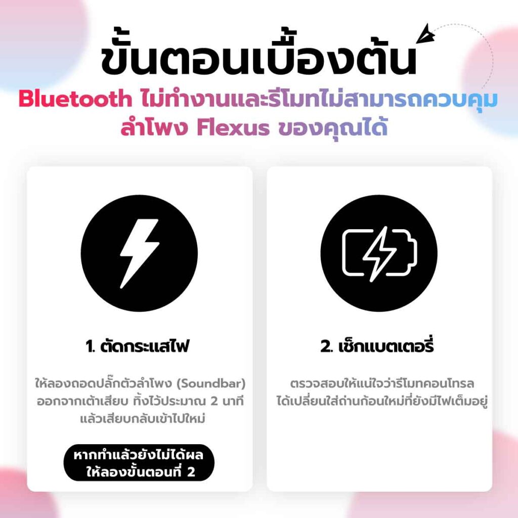 หาก Bluetooth ไม่ทำงานและรีโมทไม่สามารถควบคุมลำโพง Flexus ของคุณได้ ให้ลองทำตามขั้นตอนด้านล่างนี้ค่ะ: