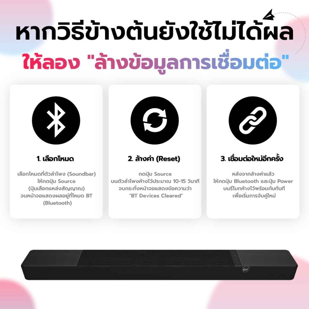 2. ล้างค่า (Reset): กดปุ่ม Source บนตัวลำโพงค้างไว้ประมาณ 10-15 วินาที จนกระทั่งหน้าจอแสดงข้อความว่า "BT Devices Cleared"