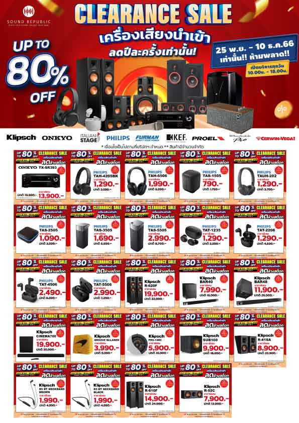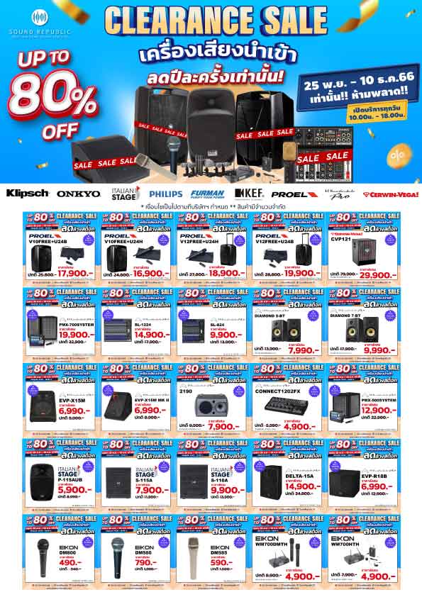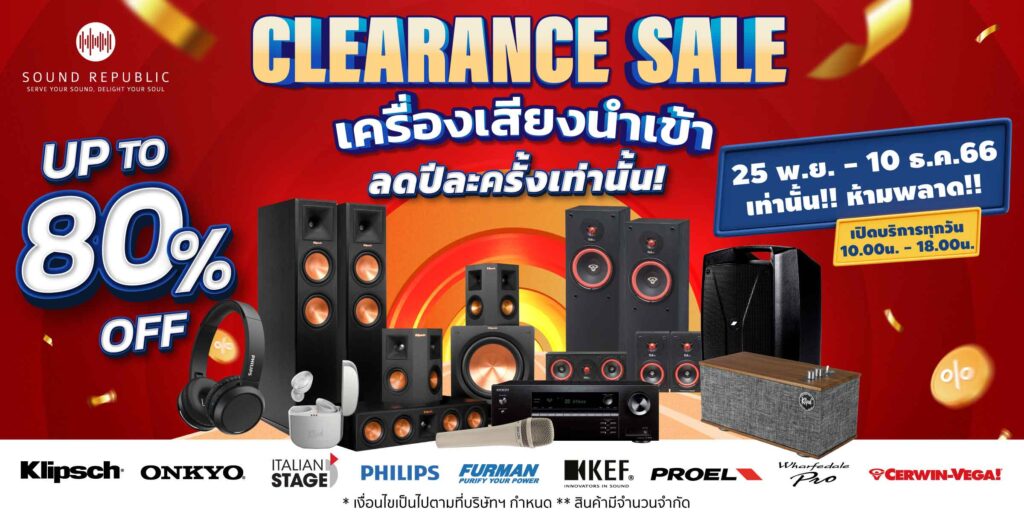 งาน Sound Republic Clearance Sale 2023 จัดขึ้นตั้งแต่วันที่ 25 พฤศจิกายน ถึง 10 ธันวาคม 2566 ณ ร้าน Sound Republic เยื้องสายใต้ใหม่ขาเข้า ภายในงานพบกับสินค้าเครื่องเสียงจากแบรนด์ชั้นนำระดับโลก ลดราคาสูงสุดถึง 80% ไม่ว่าจะเป็น อาทิเช่น KLIPSCH, ONKYO, PHILIPS, WHARFEDALE PRO, FURMAN, PROEL, AXIOM, EIKON, ITALIAN STAGE, CERWIN-VEGA และแบรนด์อื่น ๆ อีกมากมาย
