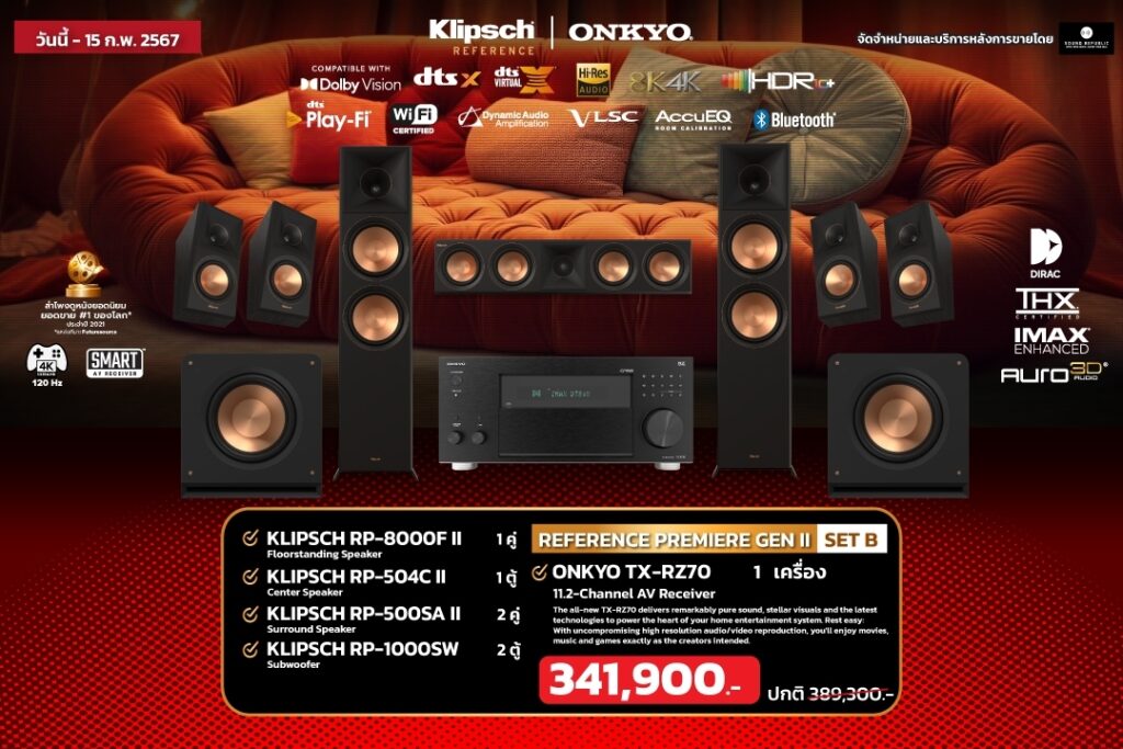 ที่สุดของ AVR อย่าง TX-RZ70 11.2 CH จับคู่กับที่สุดของชุดโฮมเธียเตอร์ อย่าง Klipsch Reference Premiere II ที่จะพาคุณสัมผัสประสบการณ์ทางเสียงระดับโรงภาพยนตร์ในบ้าน ด้วยชุดโฮมเธียเตอร์ Klipsch x Onkyo