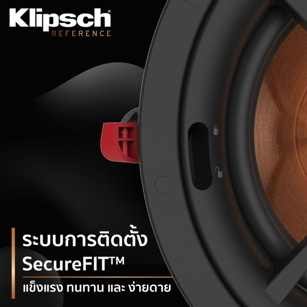 การติดตั้งแบบพิเศษให้ยึดติดกับฝ้าได้อย่างง่ายดาย เพียงแค่คุณใส่น็อตไปที่รูบริเวณมุมลำโพงฝังฝ้า และ ผลักสวิทช์สีแดงให้ลงในสัญลักษณ์ล็อค จากนั้นใช้สว่านขันน็อตกันล็อคกับลำโพงเข้ากับฝ้าเพียงเท่านี้การติดตั้งก็เสร็จสมบูรณ์ ระบบนี้เรียกได้ว่าเป็นการติดตั้งที่แข็งแรง ทนทาน และ ง่ายดาย ซึ่งทำให้การติดตั้งของคุณนั้นไม่ต้องใช้ผู้เชี่ยวชาญก็สามารถทำได้ และนี้คือจุดแข็งที่อยู่เหนือแบรนด์อื่นๆ