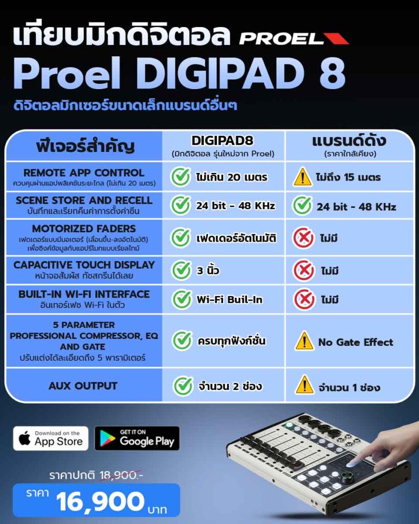 หากเปรียบเทียบกันในด้านความคุ้มค่าและความยืดหยุ่น Proel DIGIPAD 8 ไม่ได้เป็นเพียงแค่มิกเซอร์ขนาดเล็กทั่วไป แต่มันคือ "มิกเซอร์รุ่นใหญ่ที่ย่อส่วนลงมา"