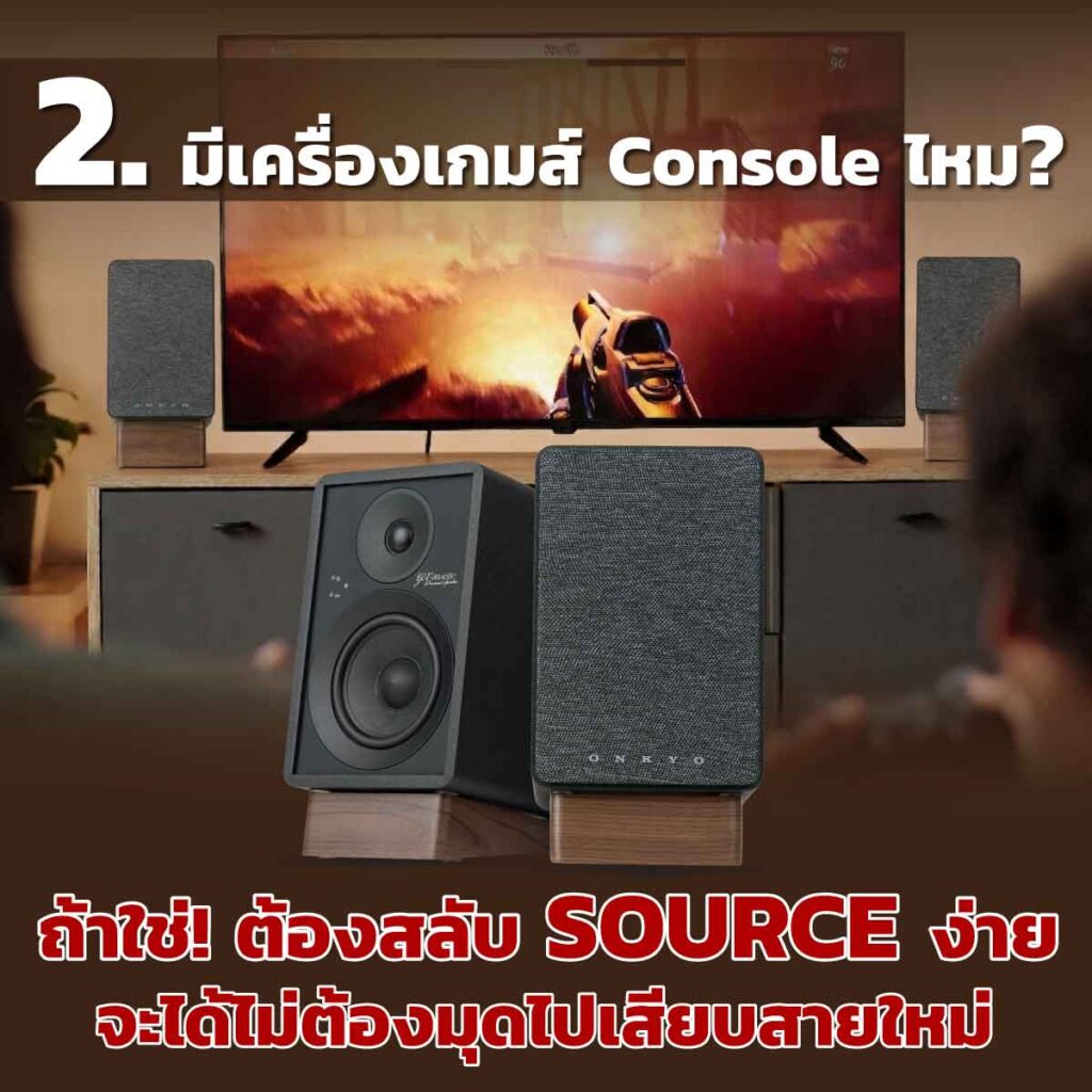 ถ้ามีเครื่องเล่นหลายอย่าง ลำโพงที่เลือก ต้องสลับ Source (แหล่งเสียง) ได้ง่าย ครับ ลำโพงที่ดีควรมีปุ่มกดสลับจากคอมไปเครื่องเกมได้ทันที ไม่ใช่ต้องคอยมุดไปหลังโต๊ะเพื่อถอดสายเข้า-ออกทุกครั้งที่จะเปลี่ยนกิจกรรม