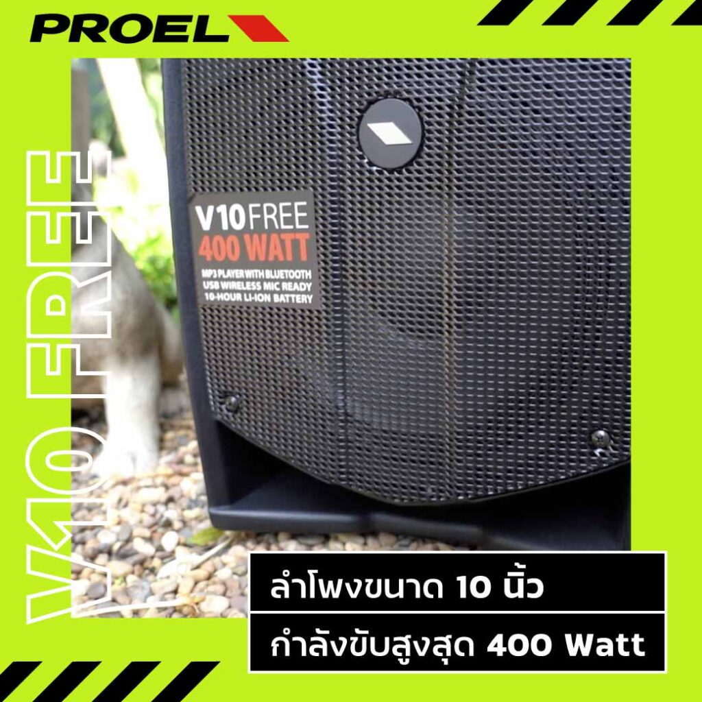 ลำโพง Active Proel V10 FREE นั้นเรียกได้ว่าเป็นลำโพงที่จะทำให้คุณนั้นมีอิสระกับเสียงเพลงและการเคลื่อนที่ มาพร้อมกำลังขับ 400 วัตต์และดอกลำโพงขนาด 10 นิ้ว ส่วนเสียงแหลมนั้นเป็นแบบนีโอไดเมี่ยมขนาด 1 นิ้ว การตอบสนองความถี่ 60 Hz - 20 kHz ความดัง 122dB และแอมป์ขยายของลำโพง Active Proel V10 FREE นั้นเป็นแอมป์ประสิทธิภาพสูงแบบ Class D