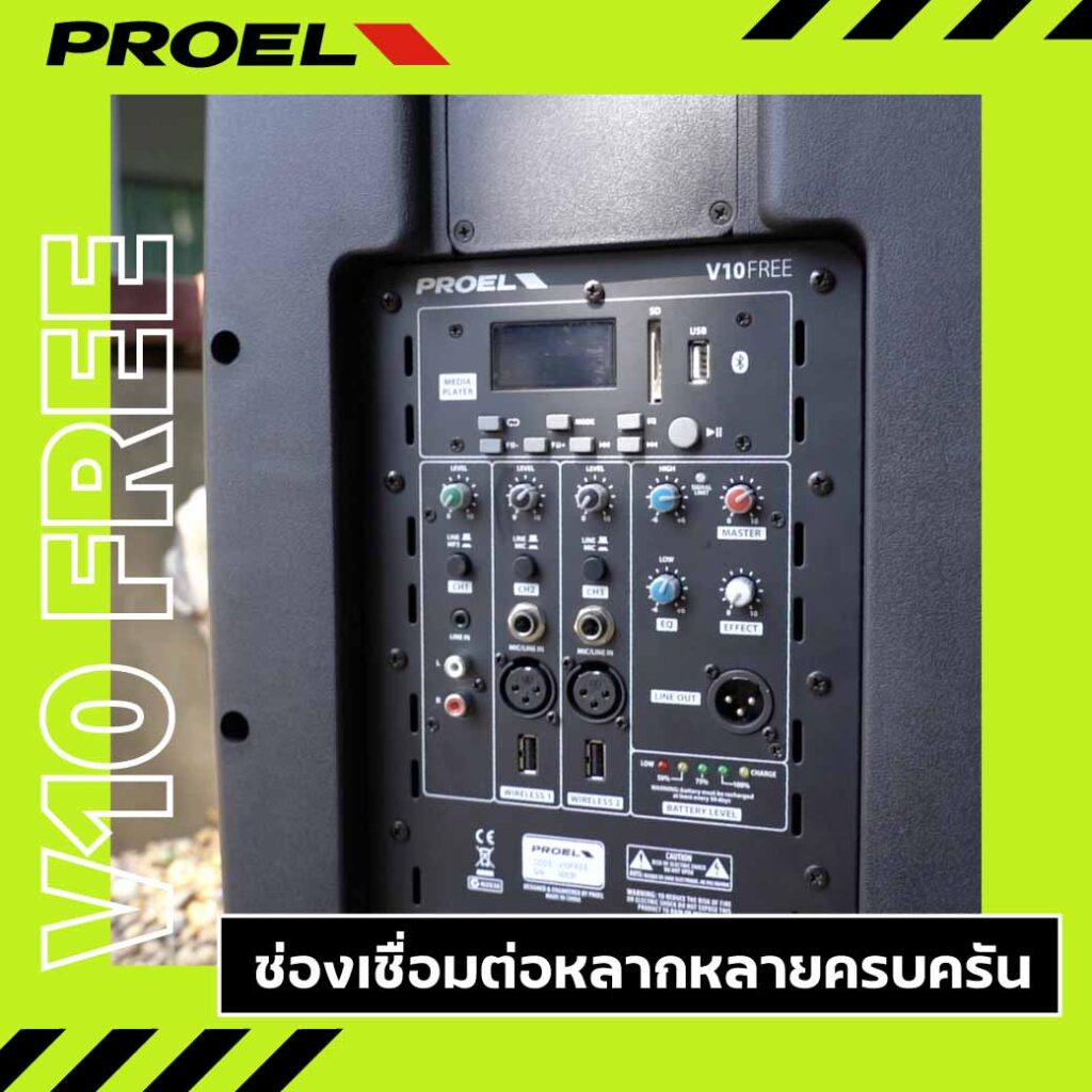 ในส่วนของช่อง INPUT หรือ ภาคมิกเซอร์ที่ให้มาถึง 3 ชาแนล ซึ่งการเชื่อมต่อถือว่าครบครันมากๆไม่ว่าจะเป็น แจ็คแบบ RCA, แจ็ค Mini Trs 3.5 mm., แจ็คแบบ XLR, TS Phone สำหรับนำไมค์หรือเครื่องดนตรีมาต่อได้และที่สำคัญยังมีพอร์ต USB ให้อีก 2 ช่องในการต่อไมค์ไวเลสแบบไร้สายสำหรับ Proel V FREE รุ่น U24H หรือ U24B 2.4GHz ( อุปกรณ์เสริมที่ต้องซื้อเพิ่ม ) และยังสามารถเปิดใช้งานเสียงเอฟเฟคประเภทเสียง Echo นอกจากนี้ยังมีมัตติมีเดียหน้าจอแบบ LCD ที่มีคุณสมบัติพื้นฐานที่ครบครัน เช่น Bluetooth ที่ทำให้คุณสามารถเปิดเพลงผ่าน Smartphone ได้เลยหรือจะเล่นเพลงผ่านพอร์ต USB และ SD Card อีกทั้งยังสามารถปรับโทนเสียง EQ ได้ 2 ย่านความถี่ คือ เสียงทุ่มและเสียงแหลม ในส่วนของ OUTPUT นั้นยังมี 1 ช่อง OUTPUT ที่สามารถนำสัญญาณออกไปลิ้งค์กับลำโพงใบอื่นๆได้หรือจะนำสัญญาณออกไปเพื่อนบันทึกเสียงก็ได้เช่นเดียวกัน