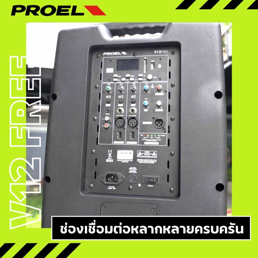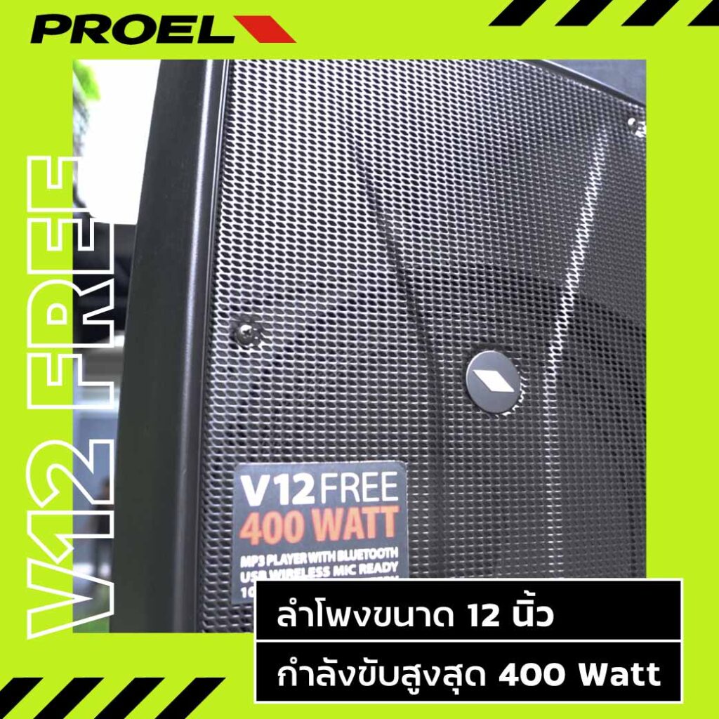 ลำโพง Active Proel V12FREE นั้นเรียกได้ว่าเป็นลำโพงที่จะทำให้คุณนั้นมีอิสระกับเสียงเพลงและการเคลื่อนที่ มาพร้อมกำลังขับ 400 วัตต์และดอกลำโพงขนาด 12 นิ้ว ส่วนเสียงแหลมนั้นเป็นแบบนีโอไดเมี่ยมขนาด 1 นิ้ว การตอบสนองความถี่ 50 Hz - 20 kHz ความดัง 123dB และแอมป์ขยายของลำโพง Active Proel V12FREE นั้นเป็นแอมป์ประสิทธิภาพสูงแบบ Class D