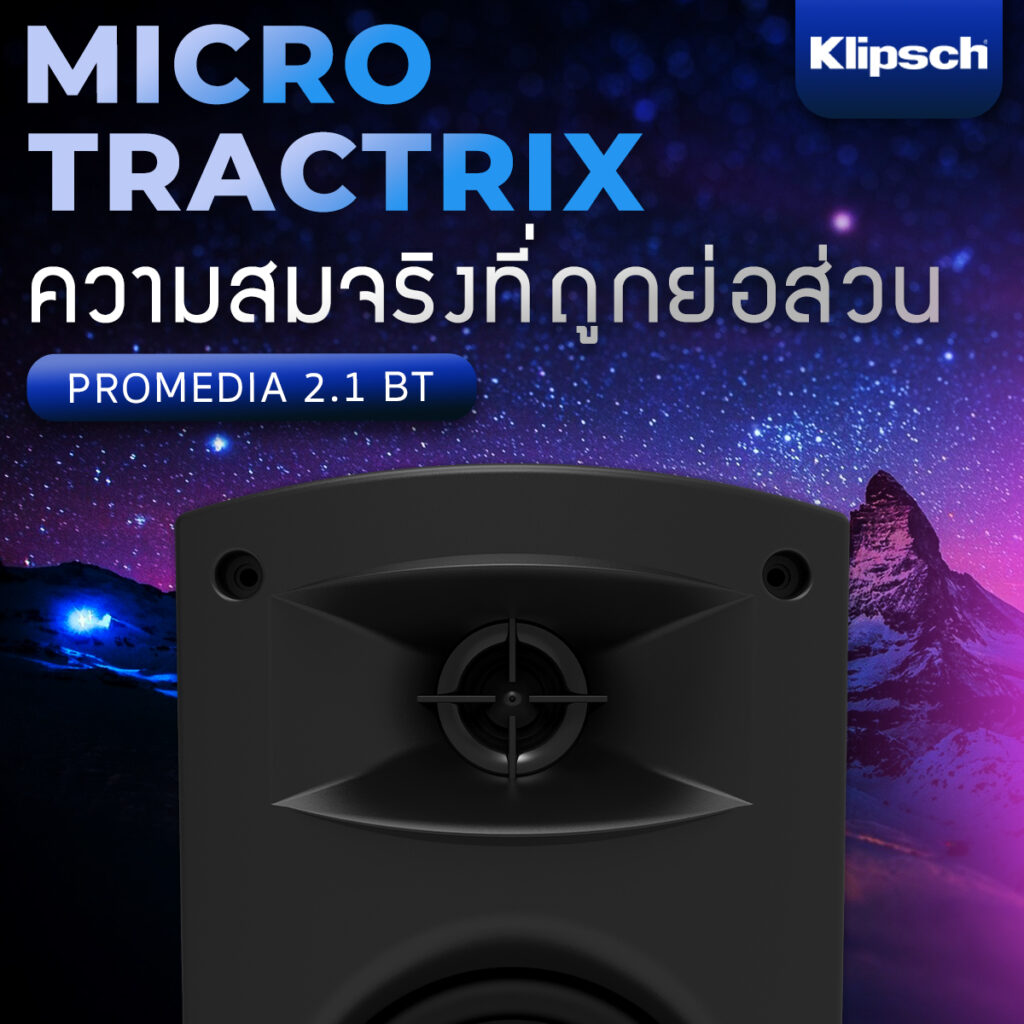 ลำโพงคอมพิวเตอร์ Klipsch ProMedia 2.1 BT Computer Speaker ได้นำเอาสิ่งที่เป็นเอกสิทธ์เฉพาะ Klipsch นำมาใส่ในลำโพงคอมฯ รุ่นนี้ด้วย เรียกได้ว่าถูกถ่ายทอดความสมจริง ธรรมชาติในลำโพง Series อื่น ๆ มาไว้ในนี้ในรูปแบบของ MicroTractrix ขนาด 90 x 40 นั้นเอง รับรองเลยว่าลำโพงคู่หน้าจอคอมฯ ของคุณจะทำเสียงที่ชัดเจน รายละเอียดครบแน่นอน