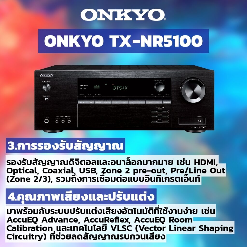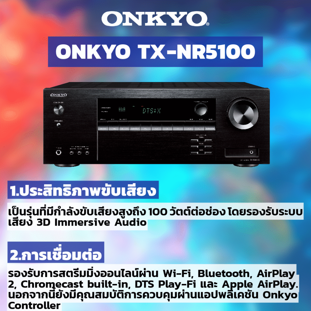 2. การเชื่อมต่อและความสะดวกในการใช้งาน TX-NR5100 มาพร้อมกับความสามารถในการเชื่อมต่อและรองรับการสตรีมมิ่งออนไลน์ผ่าน Wi-Fi, Bluetooth, AirPlay 2, Chromecast built-in, DTS Play-Fi และ Apple AirPlay. นอกจากนี้ยังมีคุณสมบัติการควบคุมผ่านแอปพลิเคชัน Onkyo Controller เพื่อการใช้งานที่สะดวกและง่ายขึ้น