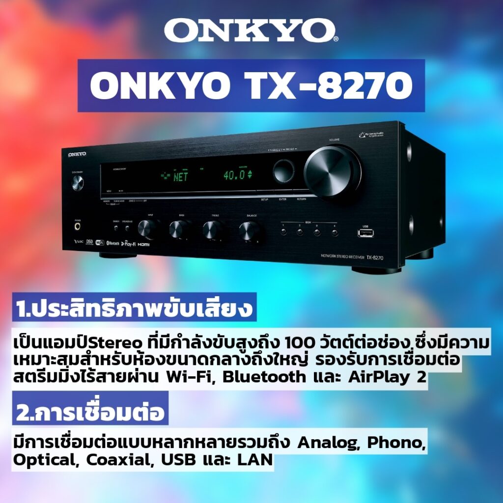 1. ประสิทธิภาพขับเสียง TX-8270 เป็นแอมป์ชนิดอินทิเกรตเอ็นท์แบบ Stereo ที่มีกำลังขับสูงถึง 100 วัตต์ต่อช่อง ซึ่งมีความเหมาะสมสำหรับห้องขนาดกลางถึงใหญ่ รองรับการเชื่อมต่อสตรีมมิ่งไร้สายผ่าน Wi-Fi, Bluetooth และ AirPlay 2 โดยสามารถเล่นเพลงผ่าน Application Onkyo Controller และรองรับความถี่สูงสุดถึง 24-bit/192kHz ในการเล่นไฟล์เพลง