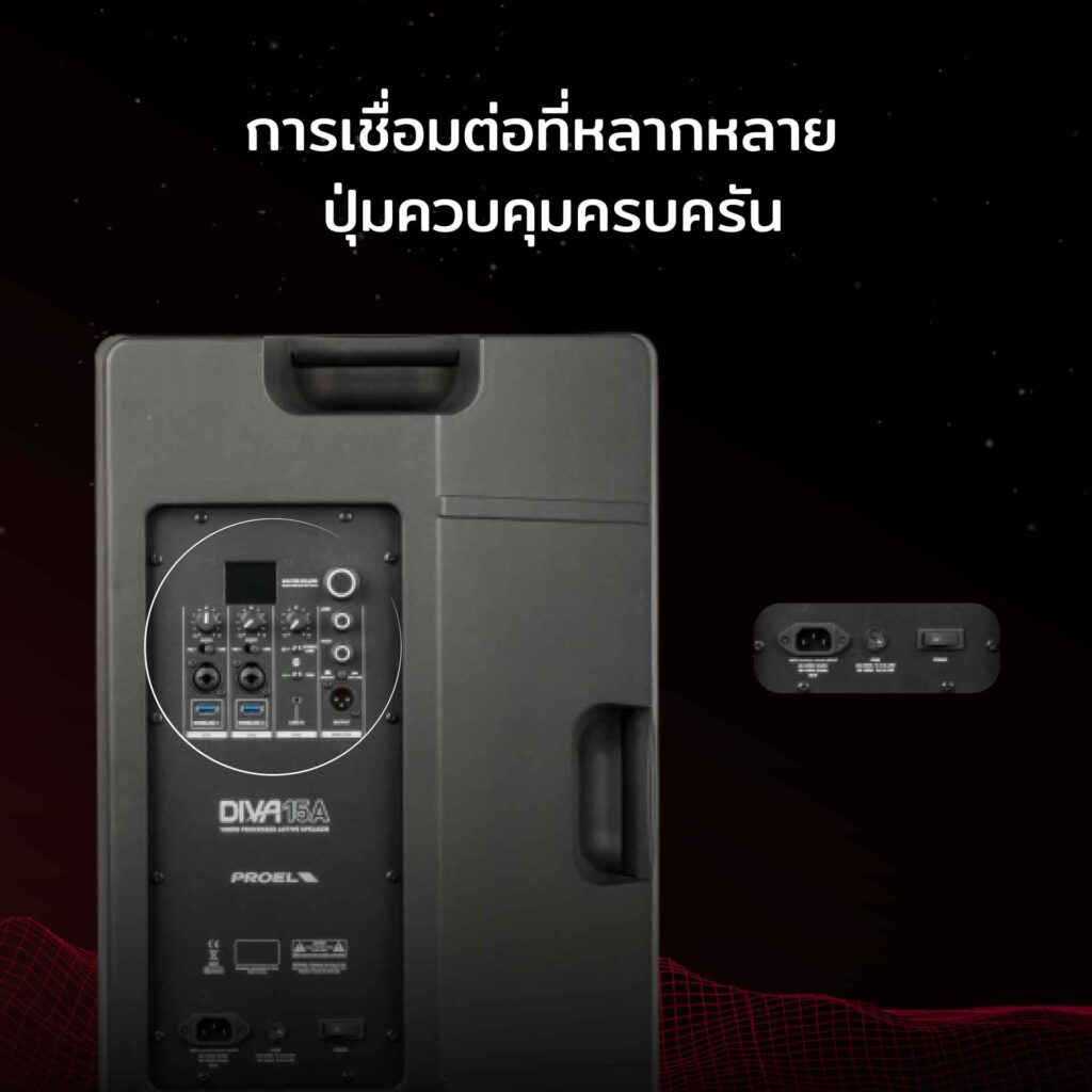 ลำโพงแอคทีฟ Proel Diva Series Active Speaker นั้นมีการเชื่อมต่อที่หลากหลาย และมีปุ่มที่ใช้ปรับเสียงย่านความถี่สูง และย่านความถี่ต่ำ +/-12 dB เลยทีเดียว ในส่วนของการเชื่อมต่อนั้น USB, Bluetooth อีกทั้งยังสามารถเสียบไมโครโฟนได้ 2 ช่องมาพร้อมการปรับเอกเฟกต์ของไมค์เพิ่มเติมได้ ไม่เพียงเท่านั้นในส่วนของ Line in มีมาให้ 2 ช่อง และ Line out 1 ช่อง