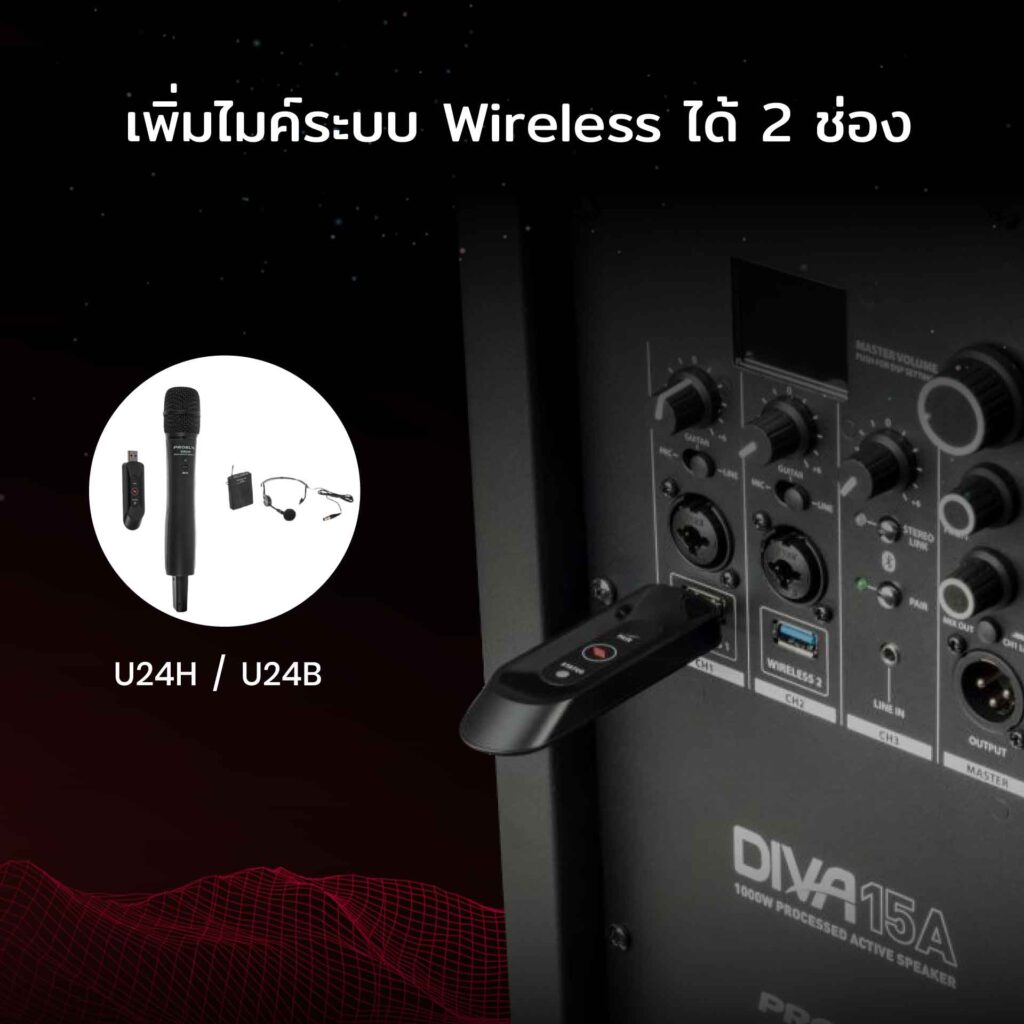 ลำโพงแอคทีฟ Proel Diva Series Active Speaker มีช่องเชื่อมต่อ Wireless 2 ช่อง ซึ่งคุณสามารถซื้อไมโครโฟน Proel Wireless ในรุ่น U24H, U24B เชื่อมเป็นไมโครโฟน Wireless ใช้ในงานอีเว้นท์ หรือ ประชุมงานสัมมนาได้