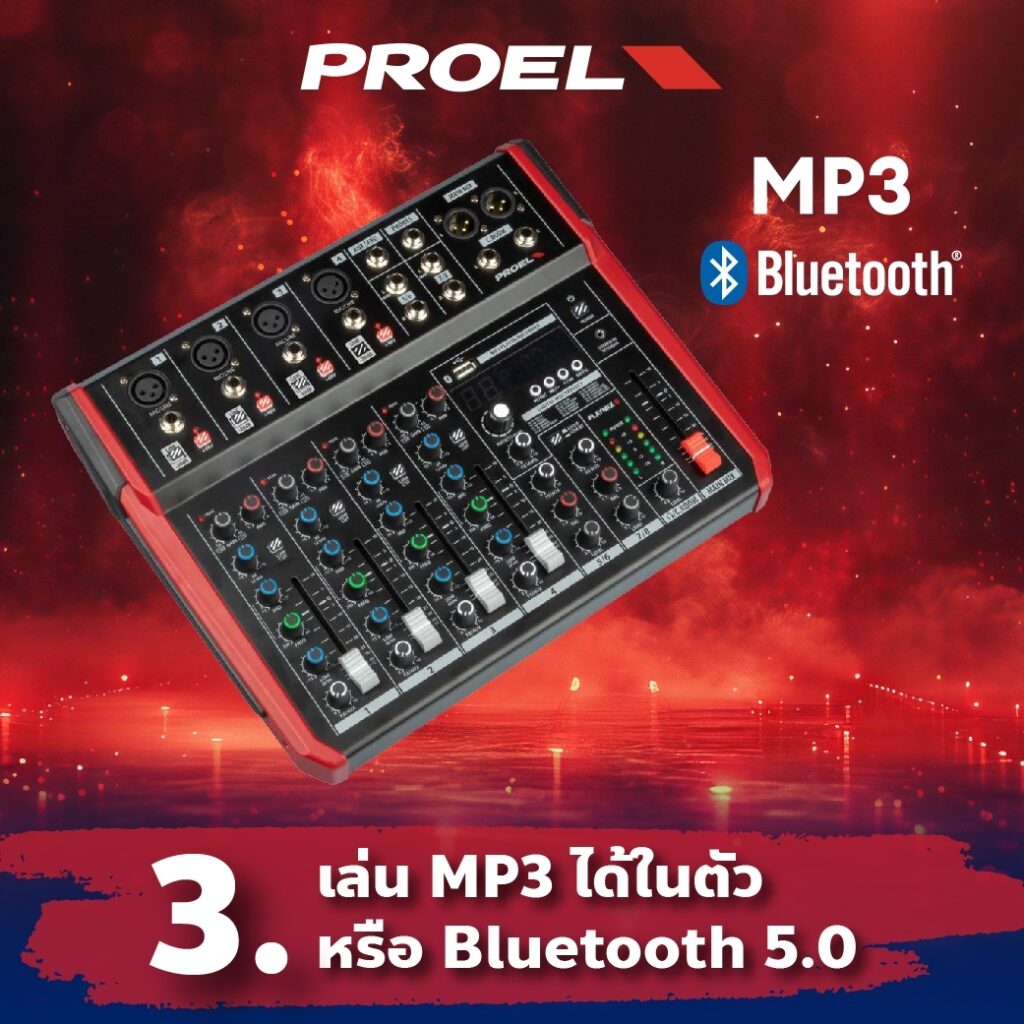 เครื่องเล่น MP3 ในตัวจาก USB Flash Drive หรือ Bluetooth 5.0 ในมิกเซอร์ ช่วยให้คุณเพลิดเพลินกับเพลง MP3 ได้อย่างสะดวก โดยไม่ต้องต่อสาย เหมาะสำหรับการใช้งานทั้งในบ้าน สตูดิโอ หรือบนเวที