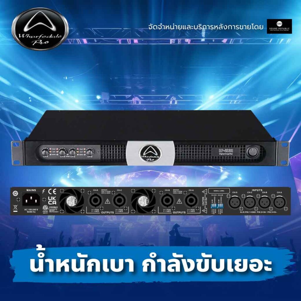 เพาเวอร์แอมป์ Wharfedale Pro DP-4030 Power Amplifier เป็นแอมป์ Class D 4 Channel เป็นรุ่นเริ่มต้นใน DP Series เหมาะสำหรับงานติดตั้งประจำที่ที่ต้องการแอมป์แบบหลายช่องสัญญาณ ราคาไม่แพง กำลังขับสูง โดยมีน้ำหนักเพียง 4.5 กิโลกรัม แต่ให้กำลังขับแรงถึง 4 x 450 วัตต์ ที่ความต้านทาน 4 โอห์ม 4 x 300 วัตต์ ที่ความต้านทาน 8 โอห์ม