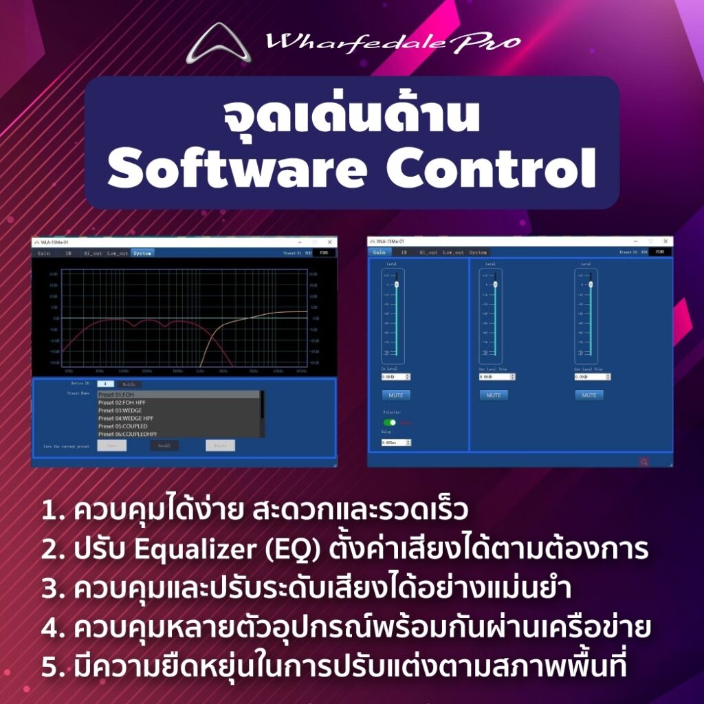 2. ความหลากหลายในการปรับแต่งเสียง Software ควบคุมของ Wharfedale Pro WLA-28A มีความสามารถในการปรับแต่งเสียงอย่างละเอียด ผู้ใช้สามารถปรับ Equalizer (EQ) และตั้งค่าเสียงได้ตามความต้องการ