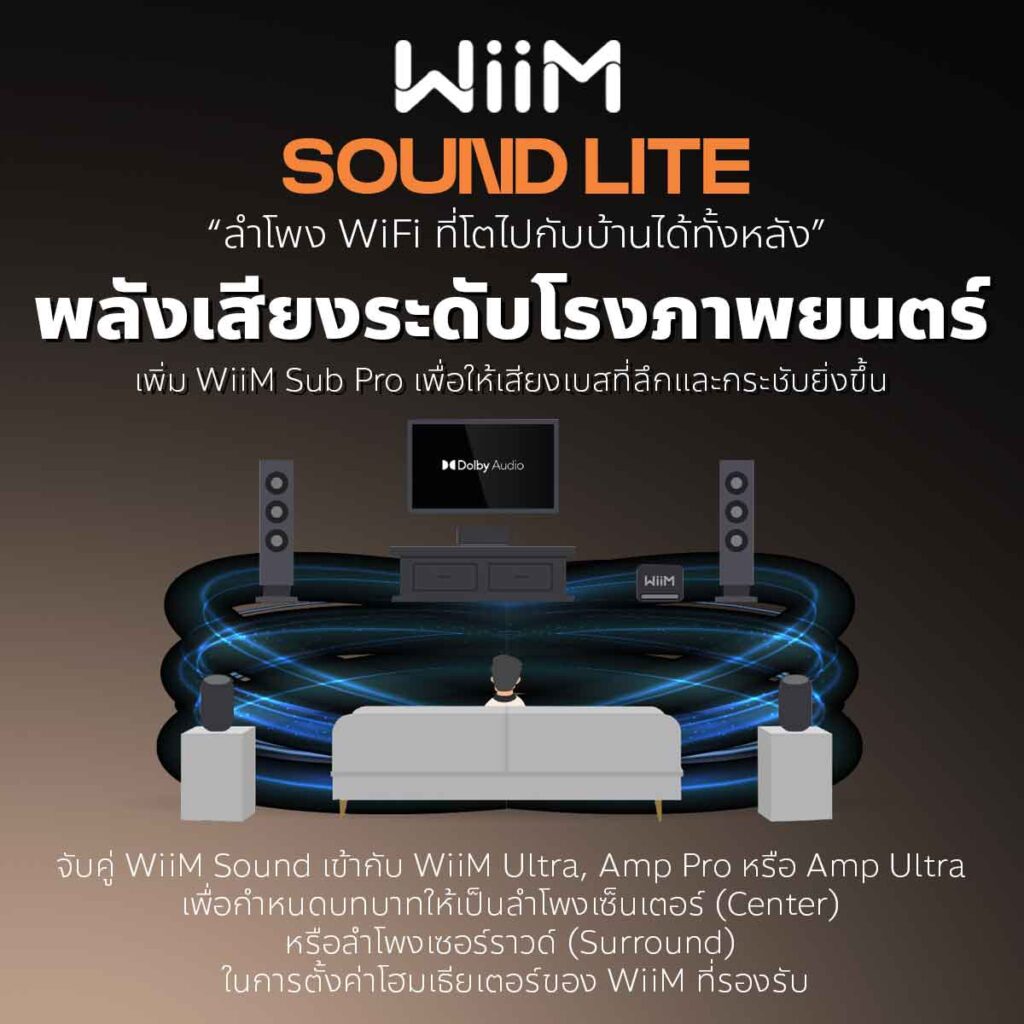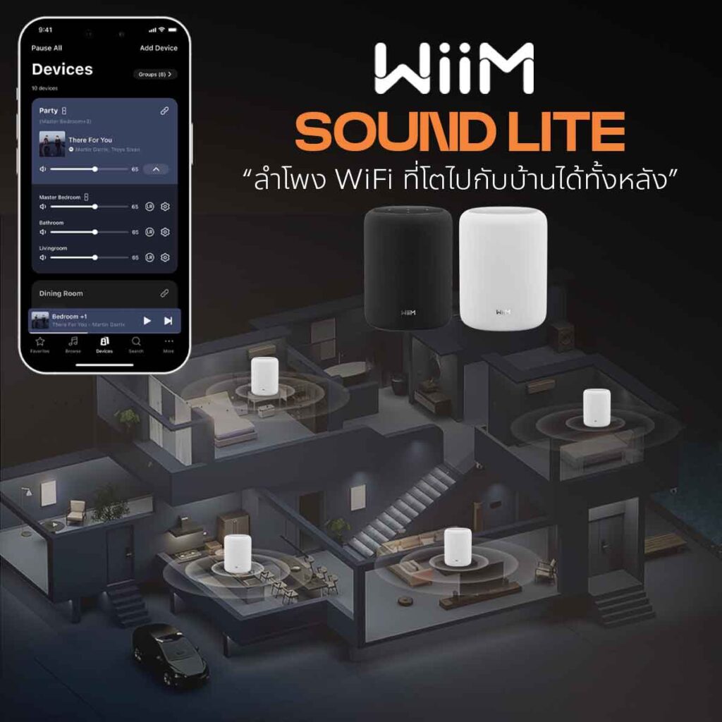 ซิงค์กับ WiiM Amps, Sound, Sound Lite, Streamers, และ Sub Pro (ซับวูฟเฟอร์) ได้อย่างง่ายดายสำหรับการเล่นเสียงหลายห้องที่ซิงค์กันอย่างสมบูรณ์แบบ