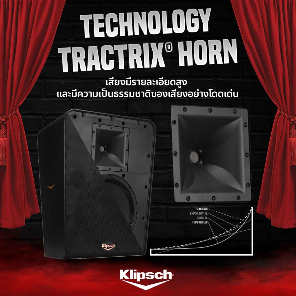 ปากลำโพง Tractrix Horn ที่เป็นนวัตกรรมเฉพาะของ Klipsch ผสานจุดเด่นของปากลำโพง 3 รูปแบบ พร้อมออกแบบให้คลื่นเสียงเคลื่อนที่ออกจากปากลำโพงด้วยการสะท้อนกลับต่ำสุด ส่งผลให้ได้เสียงที่มีรายละเอียดสูง และมีความเป็นธรรมชาติของเสียงอย่างโดดเด่น