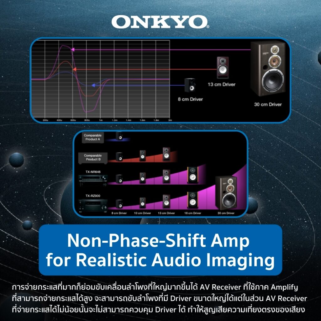 Onkyo ได้มีพัฒนาการทางด้านงานออกแบบ Amplify มานานกว่า 70 ปีซึ่งพื้นฐานหลักๆ จะเป็นการใช้เป็นเทคนิคในการออกแบบให้มีความสามารถในการจ่ายกระแสสูงแบบ High-Current กับโครงสร้างวงจรแบบ Low-Impedance เพื่อให้มีความสามารถในการควบคุม Diaphragm ของ Driver ลำโพงได้อย่างเที่ยงตรงและแม่นยำ สามารถตอบสนองกับการปรับเปลี่ยน Dynamic ได้อย่างฉับไว กับออกแบบวงจรแบบแยกส่วนที่ตอบสนองความถี่ได้กว้างเพื่อขจัดปัญหาเรื่อง Phase Shift ทำให้ได้เสียงที่ชัดใสและได้มิติของเสียงที่แม่นยำ