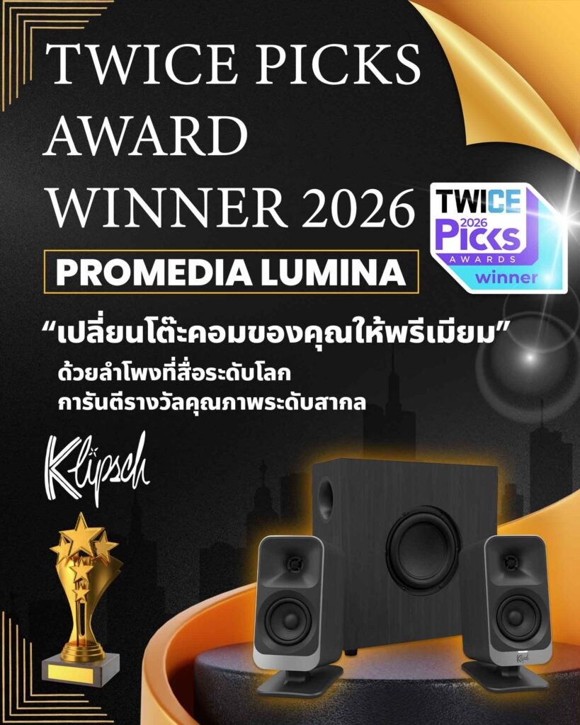 การคว้ารางวัล TWICE Picks Award Winner 2026 ในครั้งนี้ ไม่ใช่เพียงความสำเร็จของแบรนด์เท่านั้น แต่คือเครื่องยืนยันว่า Klipsch ProMedia Lumina คือลำโพงที่สามารถผสานนวัตกรรมเสียงระดับตำนานเข้ากับไลฟ์สไตล์ดิจิทัลได้อย่างไร้รอยต่อ ด้วยคุณภาพเสียงที่สื่อระดับโลกยอมรับ ผสมผสานกับดีไซน์พรีเมียมและการปรับแต่งที่ชาญฉลาด นี่จึงไม่ใช่แค่ลำโพงสำหรับดูหนังหรือเล่นเกมธรรมดา แต่คือ "ชิ้นส่วนสำคัญ" ที่จะยกระดับโต๊ะทำงานของคุณให้กลายเป็นพื้นที่ระดับ World-class สัมผัสพลังเสียงระดับรางวัลโลกในราคาที่คุณจับต้องได้แล้ววันนี้ที่ Sound Republic ครับ